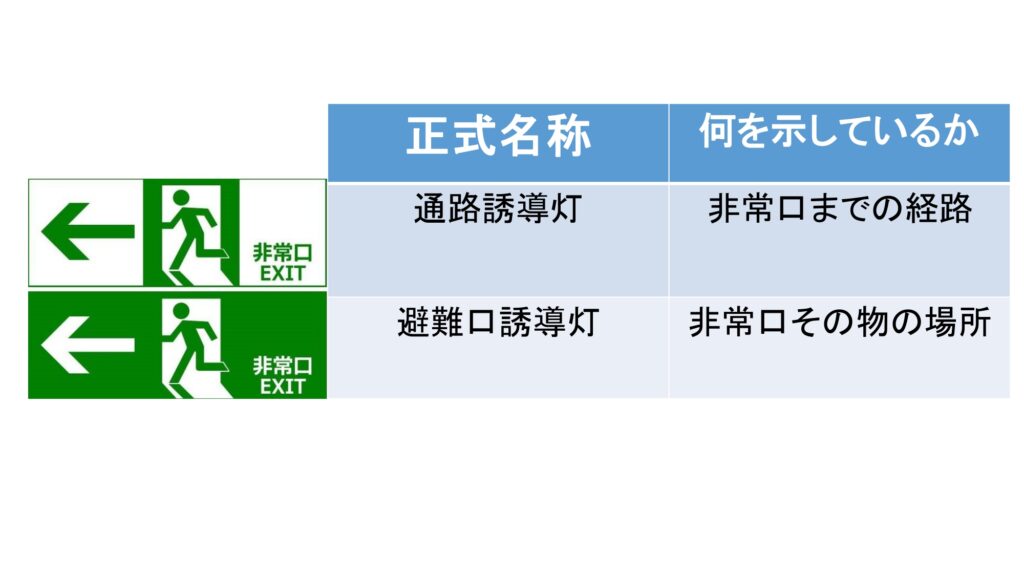 非常口は緑色と白色と2種類ありますが、違いはご存知でしょうか?実は名前も違います。緑色は「避難口誘導灯」といいます。「避難口はここですよ」と避難口のその物を示します。そして白色は「通路誘導灯」といい、「非常口へ行くには矢印の方向へ進んでね」と経路を示しています。