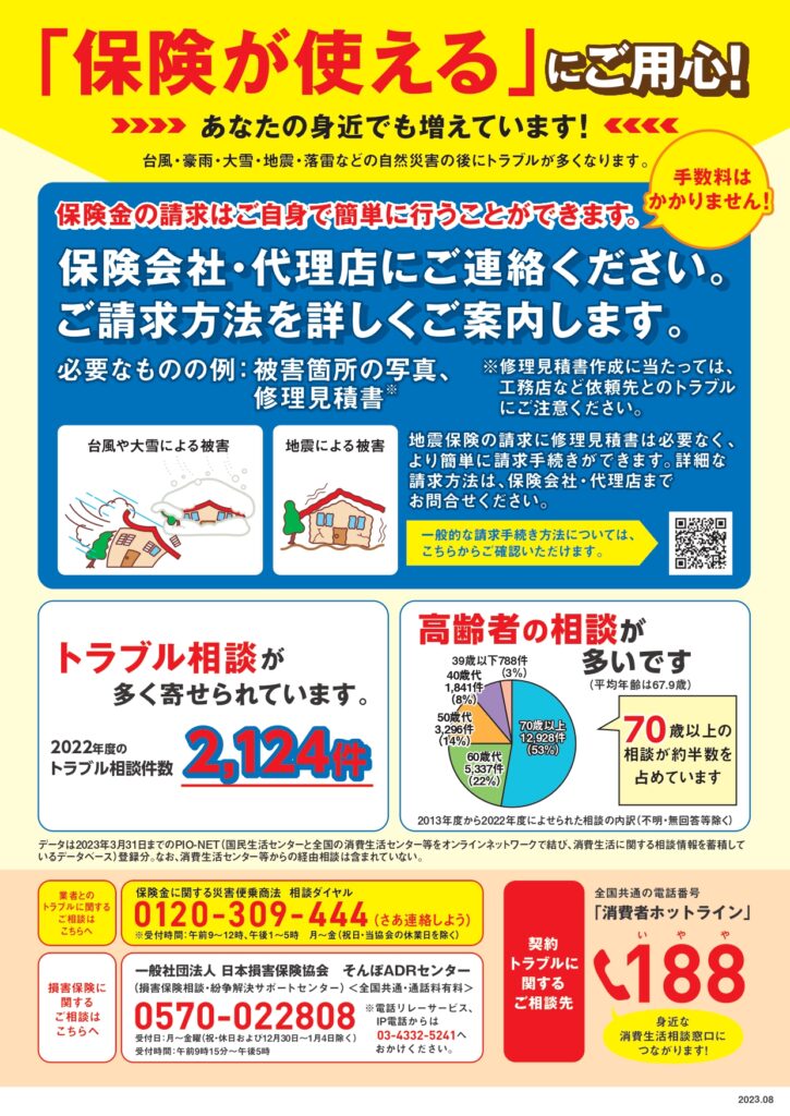 雪害補償ありの火災保険に加入されている方は、保険でお役に立てる可能性があります。雪でお家に損害がございましたら弊社担当者、もしくは弊社事務所までご一報ください。自然災害の後に、訪問やインターネット広告・SNS等で勧誘する業者とのトラブルが急増します。