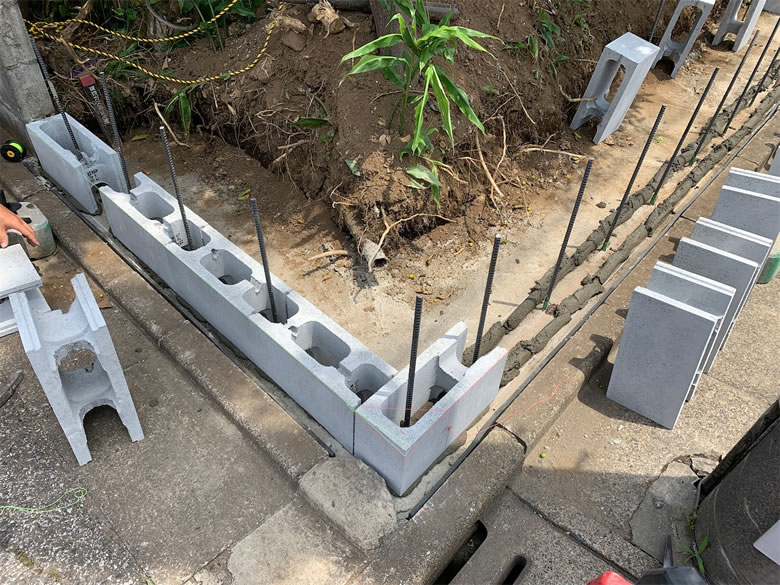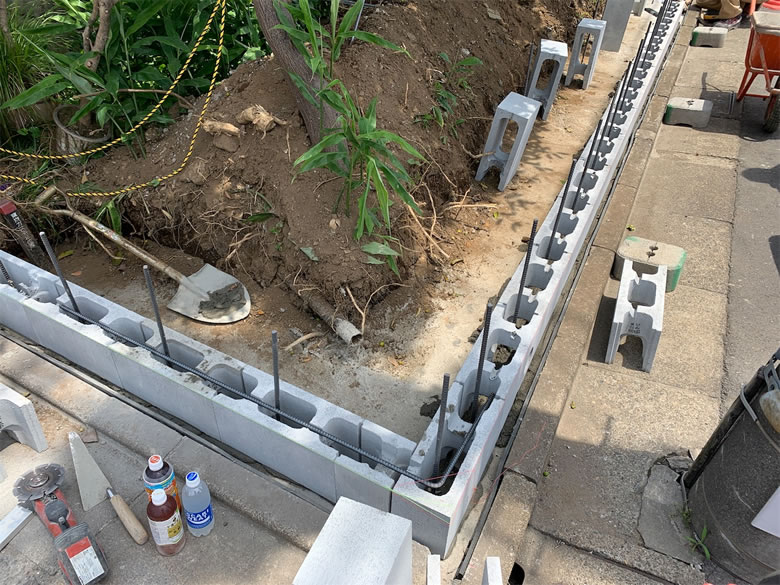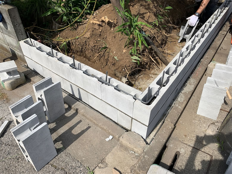 通常のブロックは「芋積み」と呼ばれる目地が上下左右通っている積み方をするのですが、「型枠ブロック」の場合には縦目地が互い違いになる「馬積み」で行います。手間はかかりますが、強度的にもこちらの積み方が有利になります。