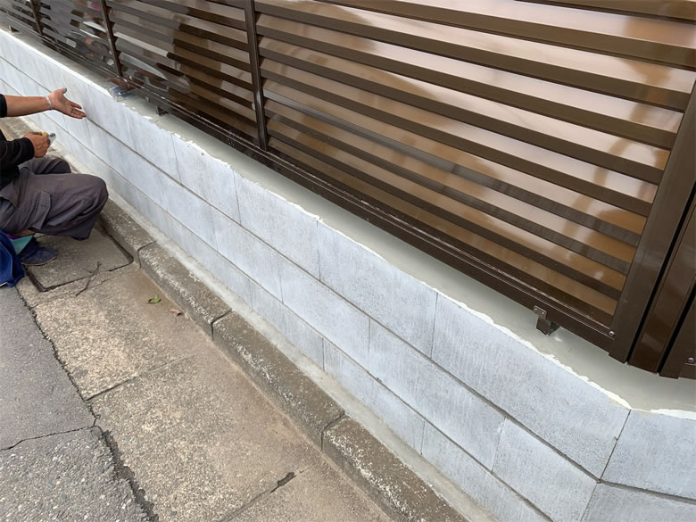 フェンス取り付け後、コンクリートブロックの上端をきれいに見せるためにモルタルの薄塗りを行います。