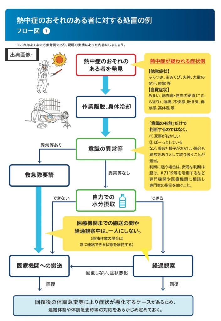 熱中症発症時の混乱を防げるよう、一連のフローを作成し明確化しておくことも大切になります。