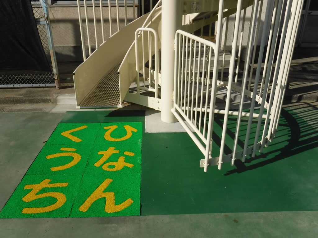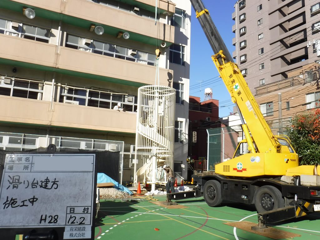 公共施設ではよく見かける避難用すべり台ですが、当社ではこのすべり台の設置工事も施工しております。