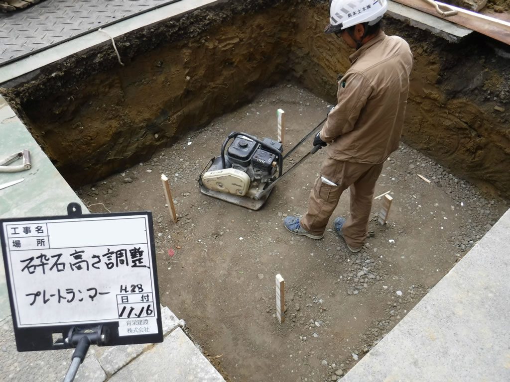 設置箇所を根切りして、転圧して、高さ調整を行って、
