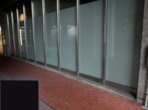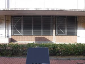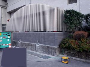 既存の金属製ガラリ+扉を一度撤去し、浸水が想定される対策高さまで化粧コンクリートブロックを組積し、その上に新たに金属製ガラリ+扉を設置しました。金属製ガラリは外周部で多くの人の目に触れる箇所に設置されているので、スチール+亜鉛メッキ製の仕様となっております。化粧コンクリートブロックについても、前例と同様に通路部のインターロッキングの色に合わせたものを採用しております。