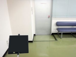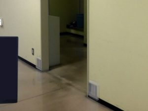 この箇所では、止水扉固定用のコンクリート壁を設置しました。周囲の壁については一部EP塗装仕上とし、床面については一部長尺シート貼りを行いました。出入口部を目立たせるために、長尺シートの色を変更しております。