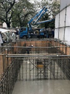 先日、雨続きの日程の中、雨が止んだピンポイントで耐圧盤のコンクリート打設を行いました。