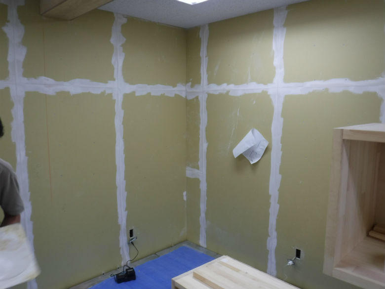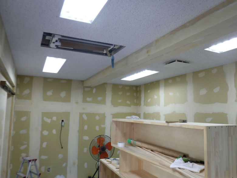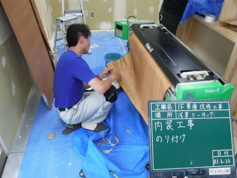 2019年8月23日 職場環境向上活動 R1.8.23 倉庫を会議室と更衣室にする さて、つづいては壁を仕上げていく工程です。 石こうボードの目地部分にパテをかっていきます! この作業が仕上がりに大きく影響してきます。 ステープル後にも丁寧にパテかい。梁型にもクロスを貼っていきます。 クロスにのり付けをしています。当社でいつもお願いをしているMさんの職人技がこれから光ります! 入隅の一部分ですが、ワンポイントで壁紙を換えているんです!だんだんと雰囲気が出てきました~