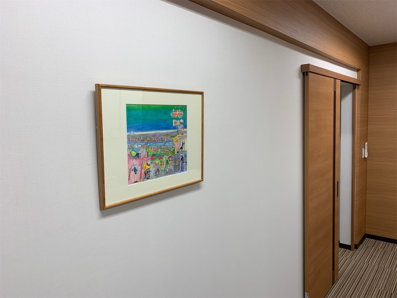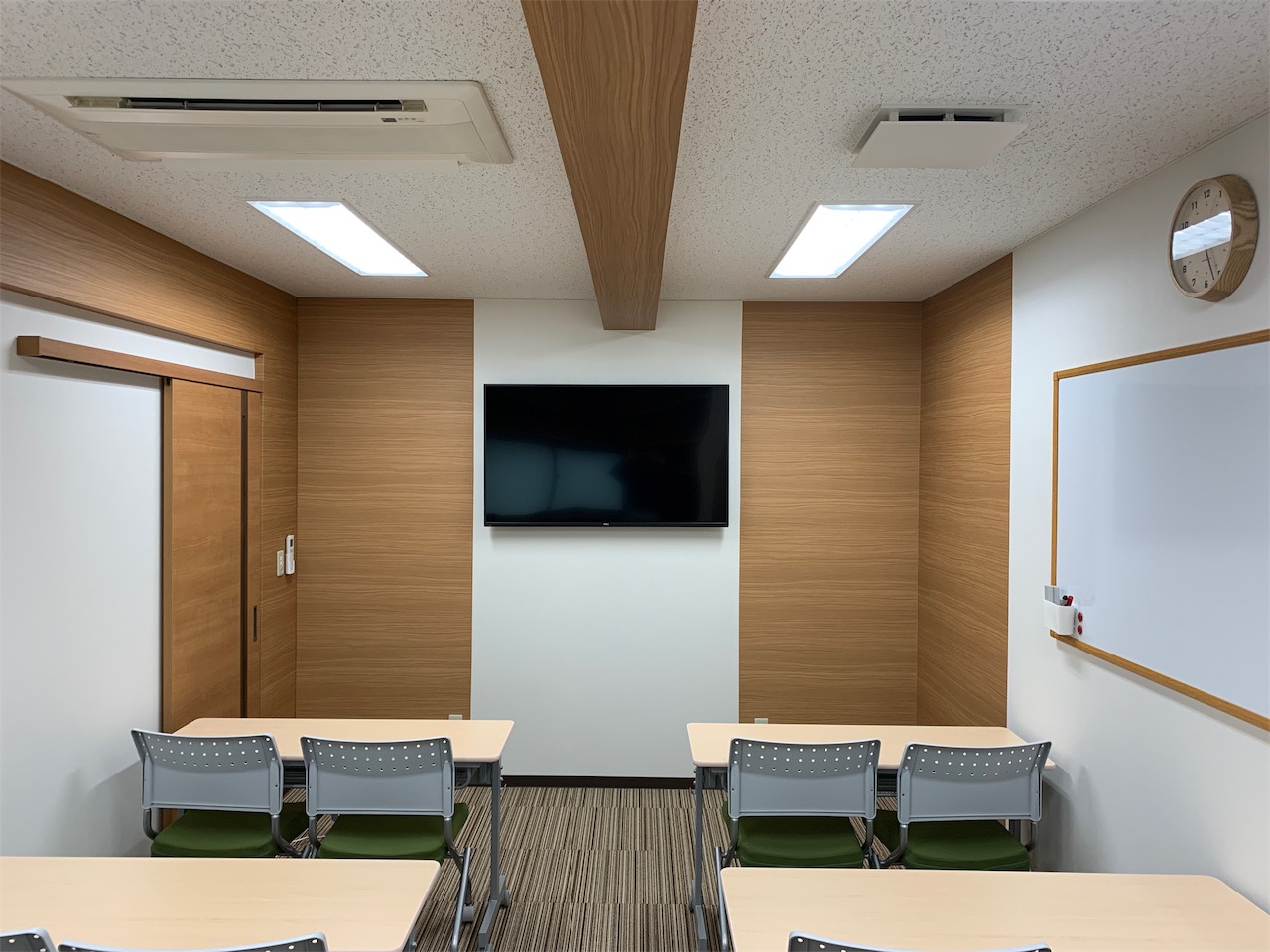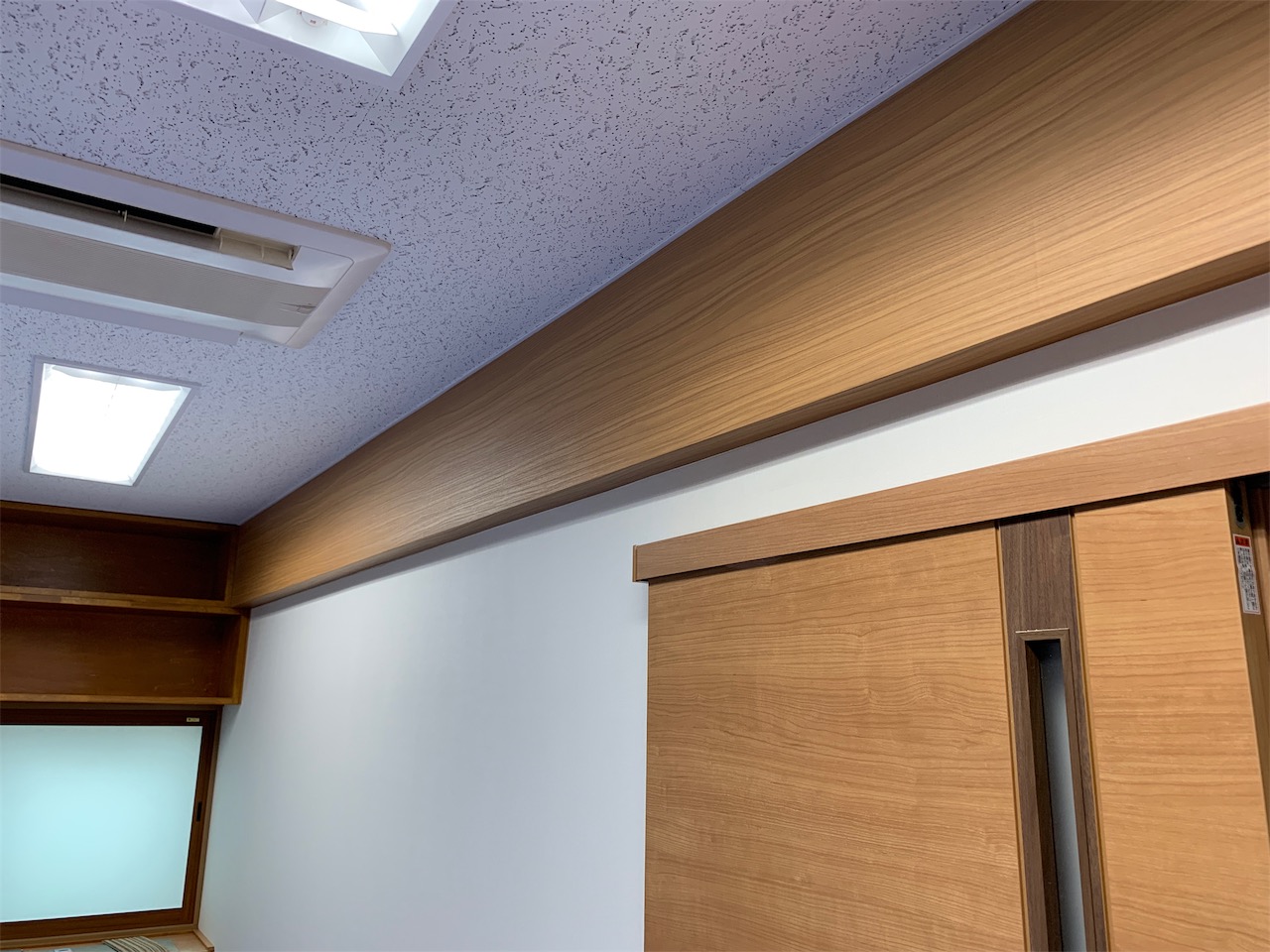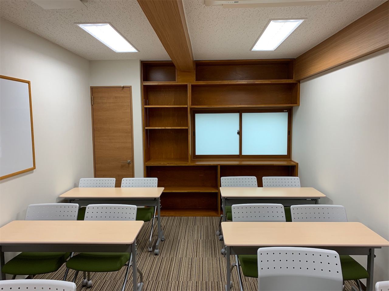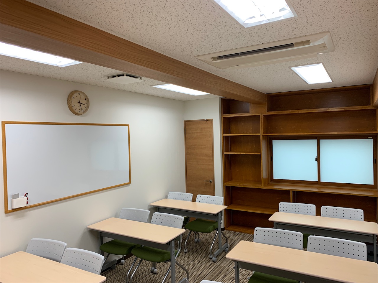 2019年9月11日 職場環境向上活動 R1.9.11 倉庫を会議室と更衣室にする シリーズでお送りしていた「倉庫を会議室と更衣室にする」でしたが、突然ではありますが、完成状況を公開致します! 木目調を意識した色合いで仕上げました 可動式のデスクを採用し、状況に応じてレイアウトを変更できるようにしています チェアは木目調との対比でモスグリーンのカバーを採用しました 打合せスペースにもなるので、収納棚を造り付けました 時計も木目調で 梁型はアクセントで木目調クロスを横使いし、扉の木目と合わせました 壁掛けの絵。なぜこの絵なのかは、後日お知らせします。