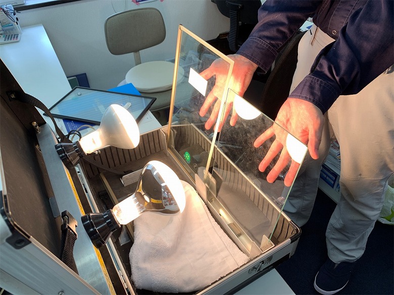 取付前にガラス屋さんに来ていただき、Low-Eガラスと通常ガラスの熱の透過状態を体感させていただきました。実際、Low-Eガラスを通すと暑さを感じないことを体感できます。