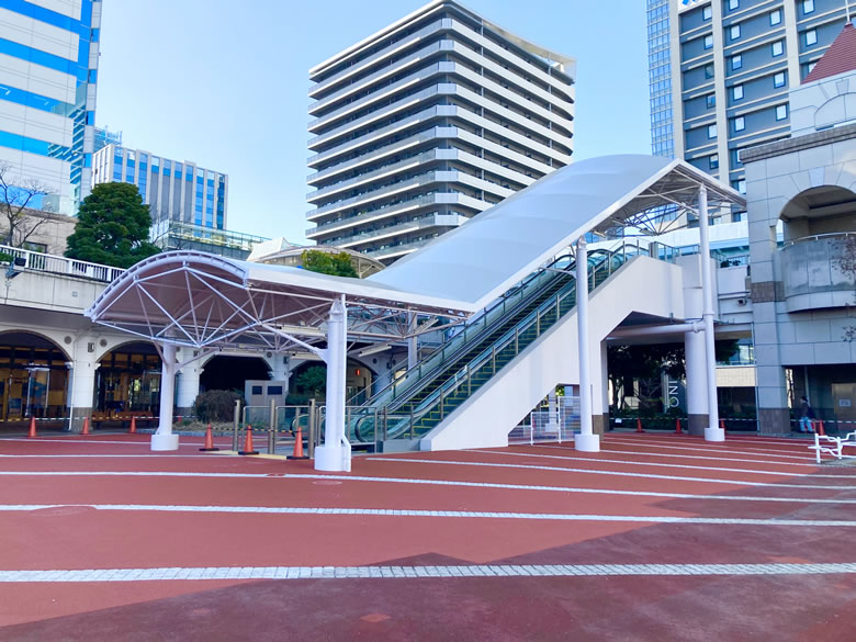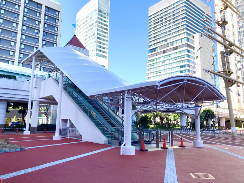私たち育栄建設株式会社は「令和4年度竹芝客船ターミナルエスカレーター屋根新築及びその他工事」を受注し、令和5年3月から着手してまいりました。工事現場は、客船ターミナル前の広場エスカレーターに屋根を新築するものでしたので、利用者や通行している人たちの安全確保を最大の留意点として、東京都や施設管理者のみなさまと綿密な打合せを行い施工しました。